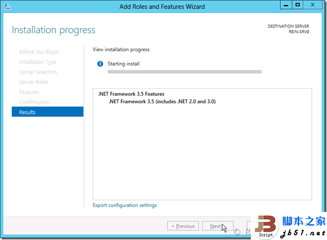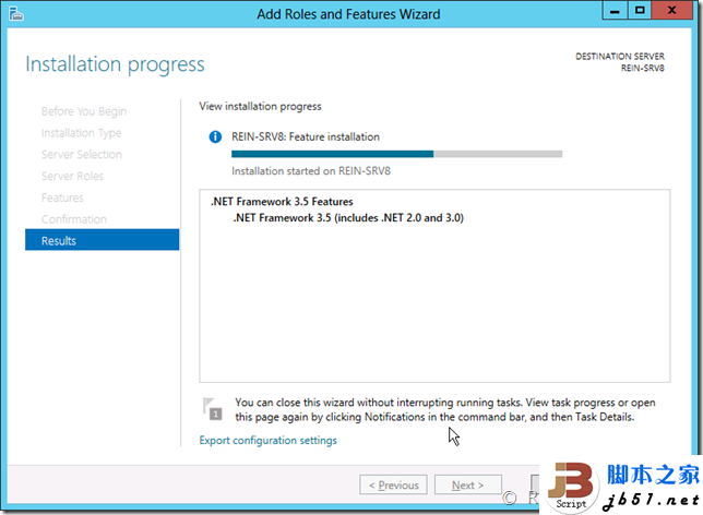 选择.NET Framework 3.5然后会在顶部出现一个加载条,单击右侧的x可以取消添加功能的选择。这个在一些误选择添加较大的功能时还是很有用的,当然小的功能这个加载条是一闪而过的。