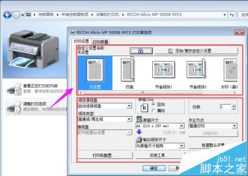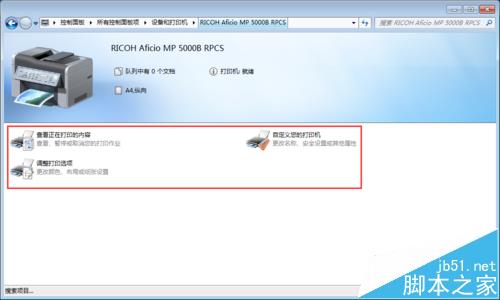在设备和打印机中双击RICOH理光MP5000之后进入设置,在这里我们可以点击查看正在打印的内容,自定义自己的打印机为其改名等等,最主要的是我们可以点击调整打印选项。