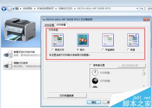 在RICOH理光MP5000的打印质量设置中我们可以设置文件类型,比如常规文件、照片、节省碳粉以及快速等等。有时打印文件并不需要太高的打印质量,这时我们就可以设置为节省碳粉、快速等模式,选择其中一个模式以后下方可以看到简要的说明,通过这个选项我们可以大大的节省碳粉,减少开支。