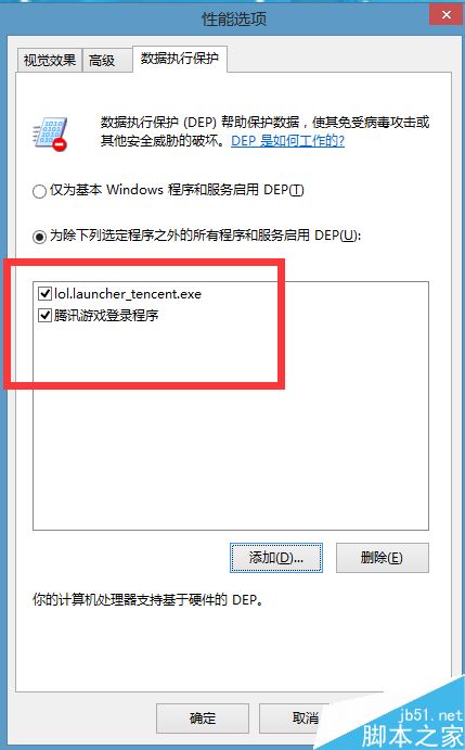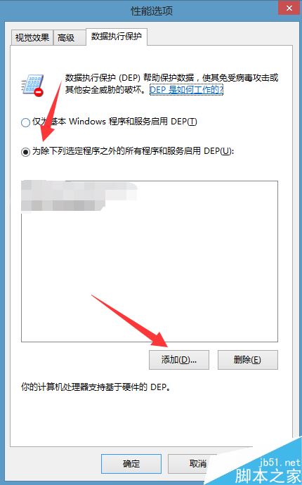 进入数据保护界面,将【为除下列选定程序之外的所有程序和服务启动DEP】,然后点击下方【添加】