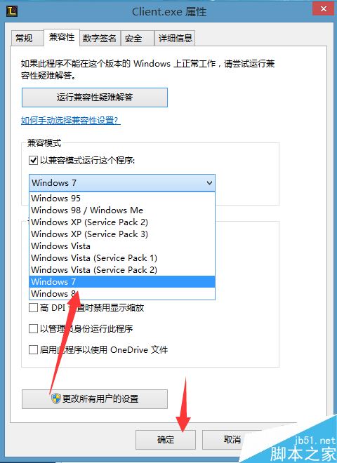 勾选【以兼容模式运行这个程序】,然后选择【windows7】点击下方【确定】