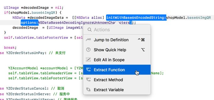 常用的重构方式都已经集成在这个右键弹出菜单中了,可见,XCode9对于重构的支持度又增加了,以后重构代码将更加方便快捷