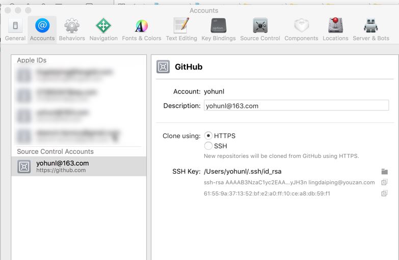 XCode - Preferences -Accouts 可以登录你的GitHub账户,登录后如下