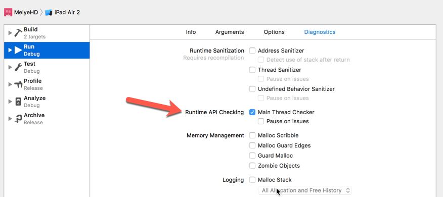 在8中,已经包含了Address Scanitizer和Thread Scanitizer,在Xcode9中,又新增了 Undefiner Behavior Scanitizer,它可以实时的检测一系列的问题.不过我们更能明显感受到的是Main Thread Checker,它可以在运行时确保你没有把UI更新 代码写在了非主线程中