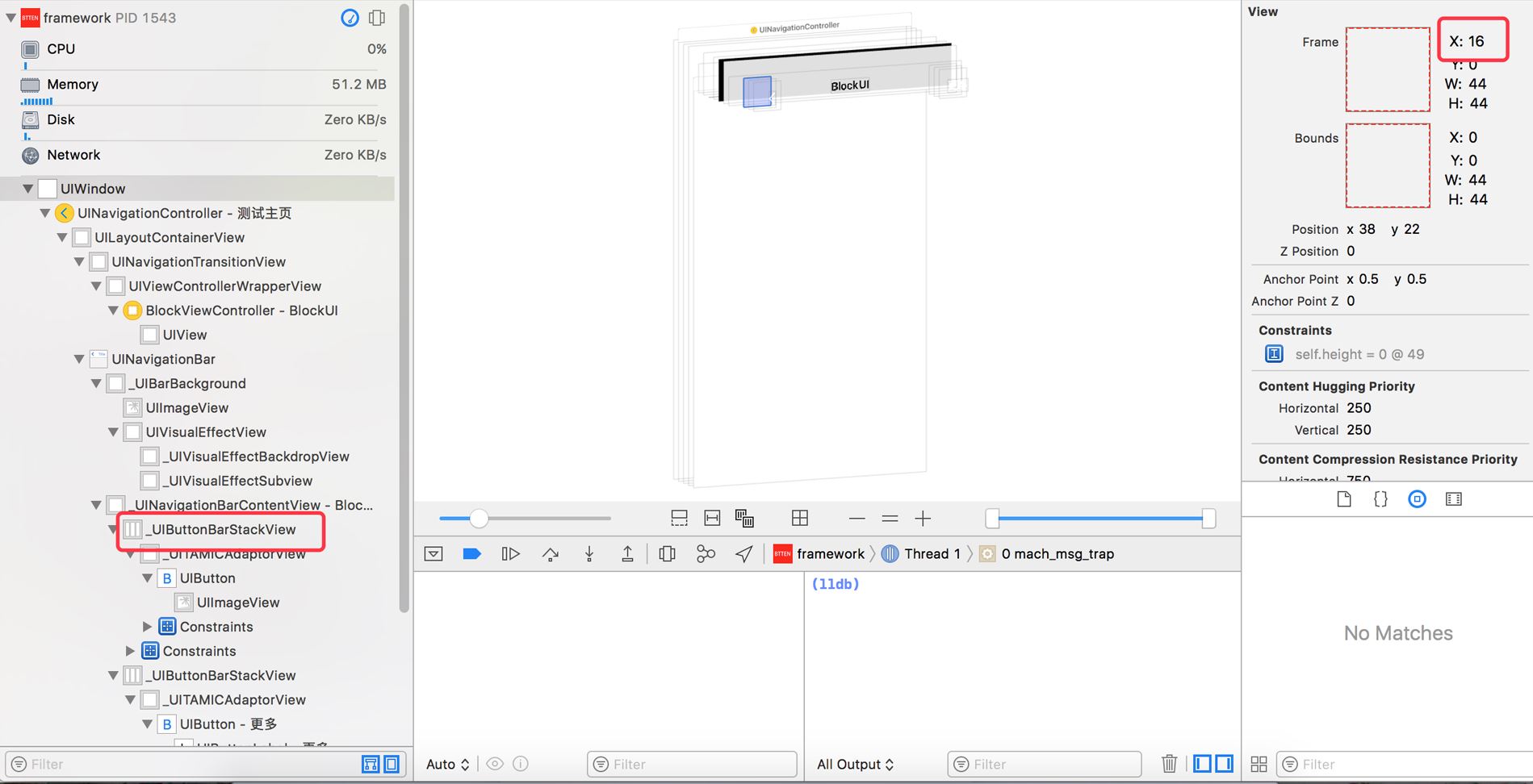 从viewDebug的界面上观察可以看到需要将UIButtonBarStackView距离左边和右边的16的约束改为0即可.