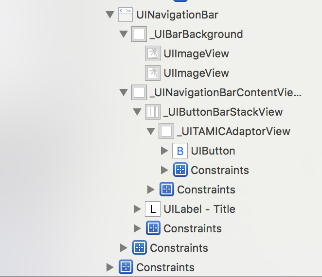 在iOS11之后,苹果添加了新的类来管理,可以看到titleView直接加在_UINavigationBarContentView上,UIBarButtonItem则添加在_UIButtonBarStackView上面,而_UIButtonBarStackView则添加在_UINavigationBarContentView上面,最后添加到UINavigationBar上面,如下图所示: