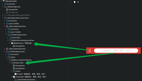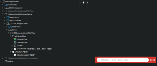 网易云音乐首页和搜索页面的导航栏视图层级,titleView都使用MCSearchBar来实现,并且设置了导航栏左右两边的按钮 。这类似上文所说的第二种思路。
