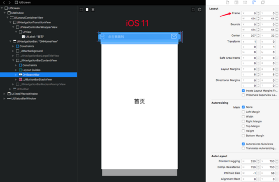 查看视图层级会发现,iOS 11以下,设置titleView,x的默认坐标居然是12,而iOS 11是0。所以设置textField的x坐标的话,在iOS 11下必须多出12才会是一致的位置。