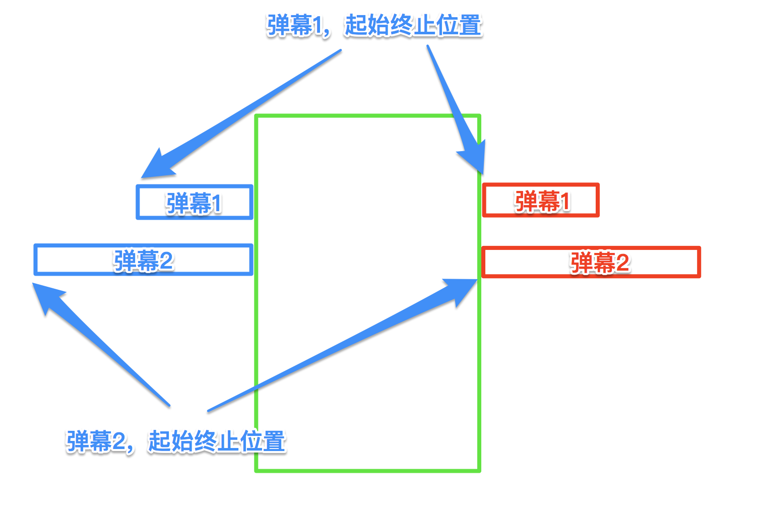 速度要求一致的话,需要考虑几点,首先如下图所示,红色代表弹幕起始位置,蓝色代表弹幕终止位置,长度代表它们的实际长度。当我们设定动画的时候,采用[UIView animationWithDuration.....]这个动画,设定duration为3s的话那么弹幕1的速度为(屏幕宽度+弹幕1宽度)/3,弹幕2的速度为(屏幕宽度+弹幕2宽度)/3,因为弹幕2长度大于弹幕1的长度,所以弹幕2的速度大于弹幕1的速度。(对于依据弹幕长度调整速度的需求来说,这里相对简单一些,不需要专门去计算速度,唯一麻烦的是需要考虑速度不一致带来的重叠问题)