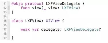 当我们创建的协议遵守其它协议的情况下,只是这样写并不会报错,接下来我们在LXFView中添加一个代理属性,为避免循环引用,代理属性需要用weak修饰