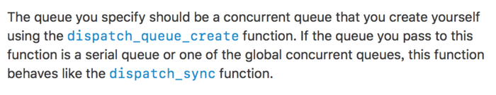 注意:看图片中注释的哪一行代码,dispatch_global 跟 dispatch_barrier 结合起来是起不到barrier 的作用的,查阅dispatch_barrier的开发者文档我们发现如下一段描述: