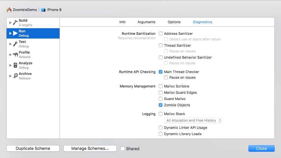 我们大家都知道,如果在XCode中开启了Zoombie Objects。如图。
