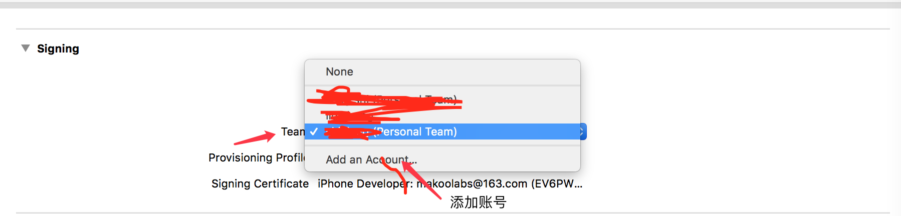 如果你还没有苹果账号需要注册一个,只需点开Team选项列表,选择Add an Account,: