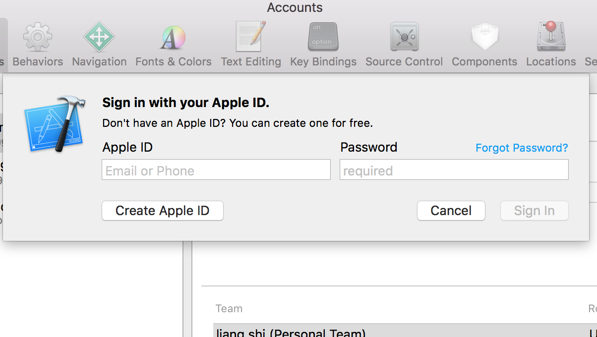 然后选择Create Apple ID,会弹出注册步骤,完了按注册步骤引导注册好账号,验证完邮件,之后Team这个选项就会出现xxx(Personal Team),选择这个这时xcode就会帮你自动生成Certificate ,和Provision