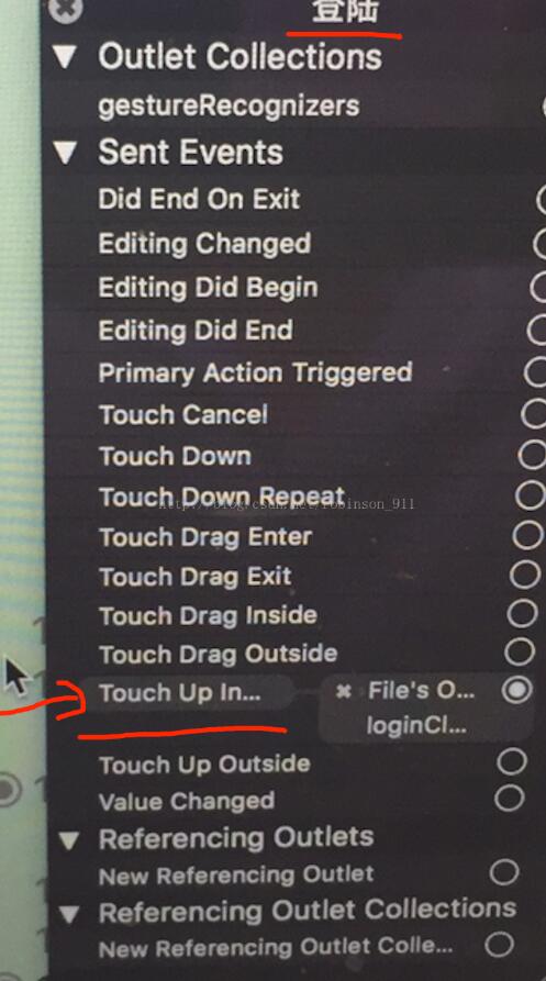 选中Xib中的UIButton控件,右键出现下图的属性,选择Touch Up Inside(UIControlEventTouchUpInside),也就是button点击的事件属性,然后拖到代码中就会出现如下点击button的事件方法,如此就建立了Xib中Uibutton与代码建立了联系。