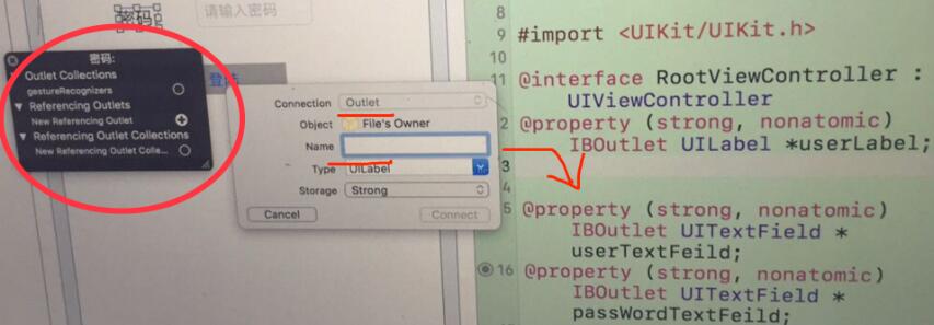 @property (strong,nonatomic) IBOutletUITextField *userTextFeild; (UI与代码就建立了连接)
