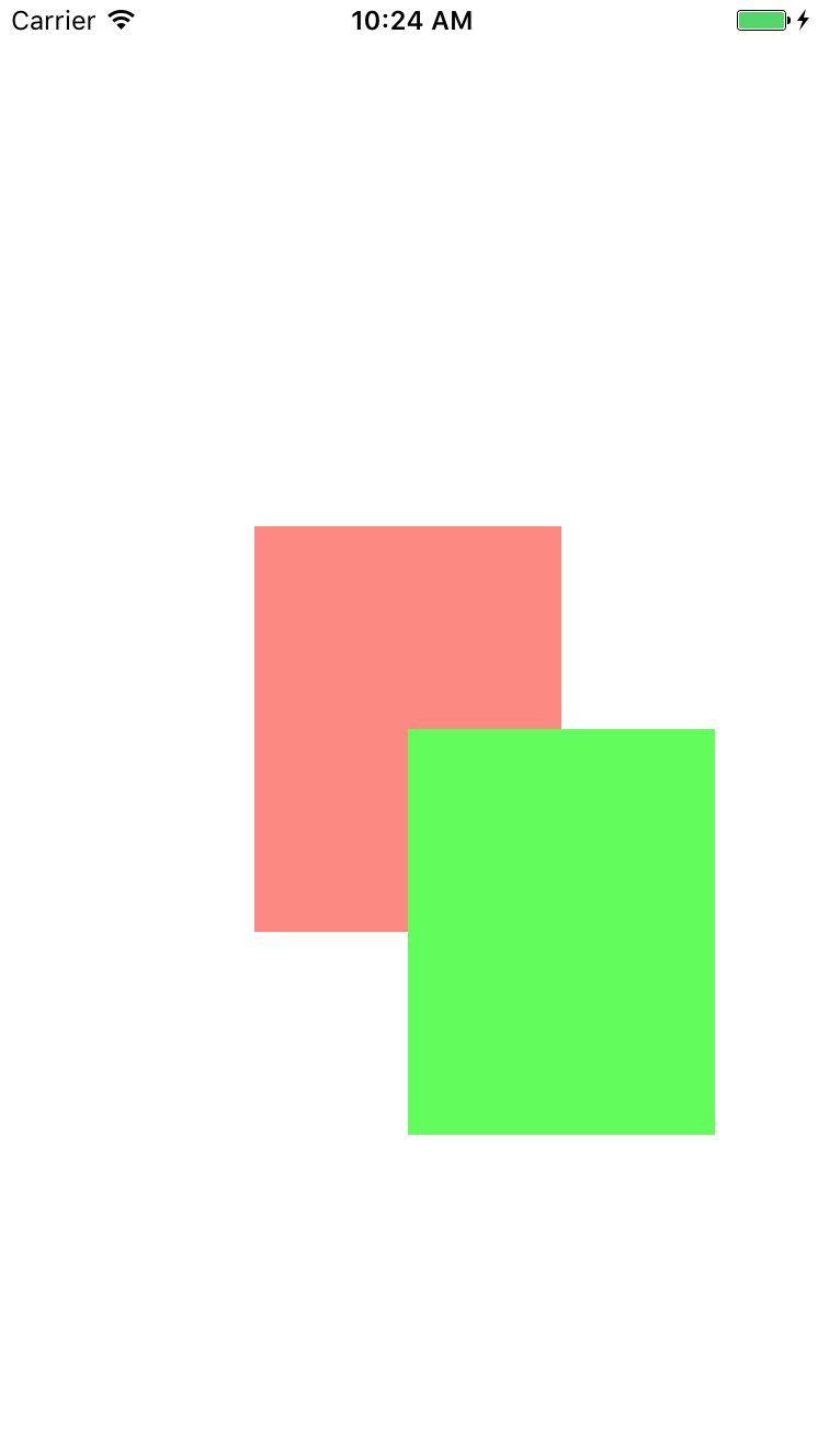 坐标系无非就是(x,y,z),我不对(x,y)进行讲解,着重讲解一下z.在视图坐标系中,z轴与我们在数学中的z轴是有相同的效果的,他表现的是垂直的坐标,如果我们为图层设置z轴坐标该图层将会在未设置z轴坐标或者小于该z轴坐标的图层上方展示.为了着重表现该现象,我在绿色视图中添加一个蓝色图层与红色图层,先看一下代码清单.