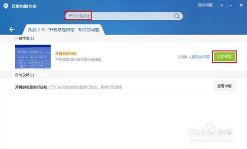 建议下载并安装【百度电脑专家】。打开【百度电脑专家】,在搜索框内输入“开机总是自检”,在搜索结果里面选择【立即修复】,修复完成后重启电脑观察是否还会频繁自检: