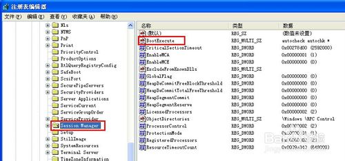 依次展开注册表【HKEY_LOCAL_MACHINE\SYSTEM\CurrentControlSet\Control\SessionManager】找到右边的【BootExecute】: