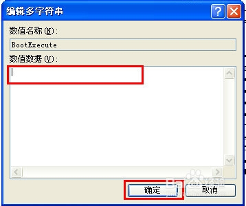 3、双击【BootExecute】,清空【数值数据】里面的内容,点击【确定】后重启电脑: