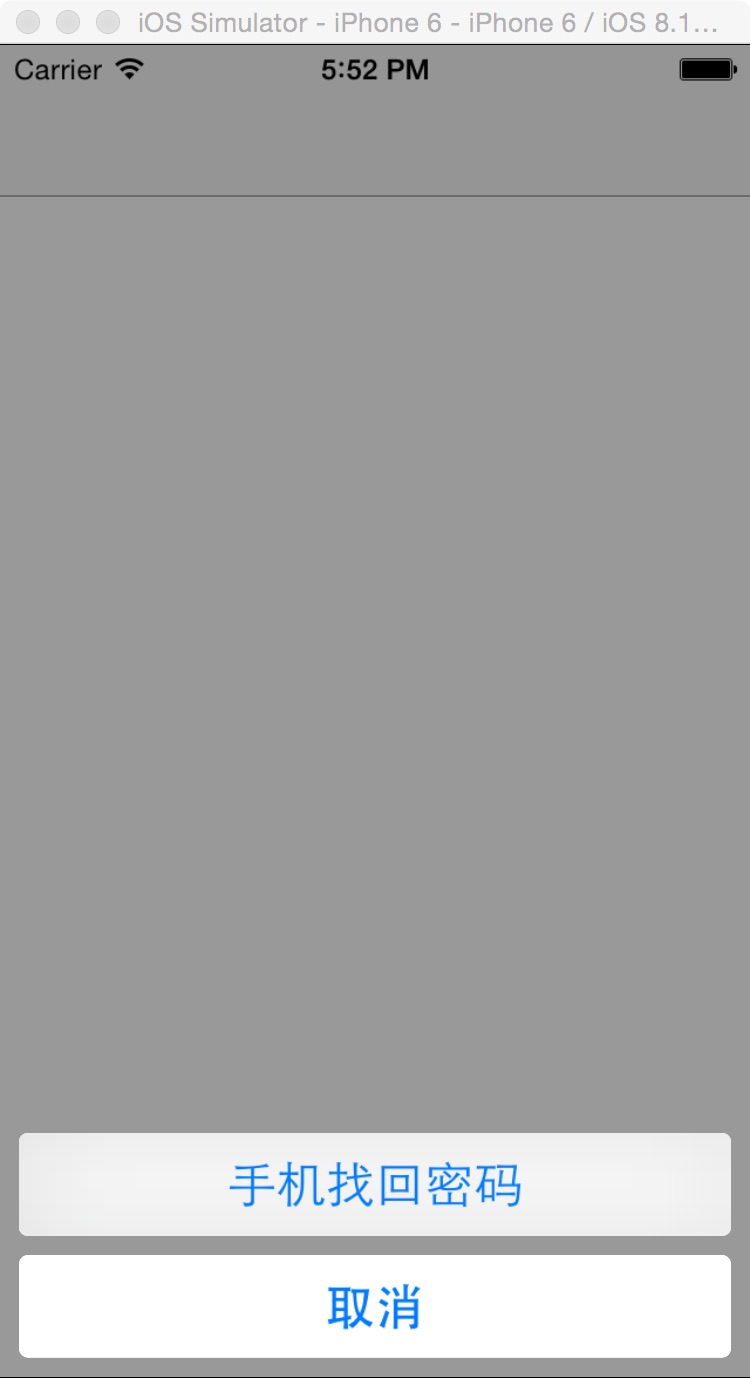 UIActionSheet *actionSheet=[[UIActionSheet alloc]initWithTitle:nil delegate:self cancelButtonTitle:@"取消" destructiveButtonTitle:nil otherButtonTitles:@"手机找回密码", nil];