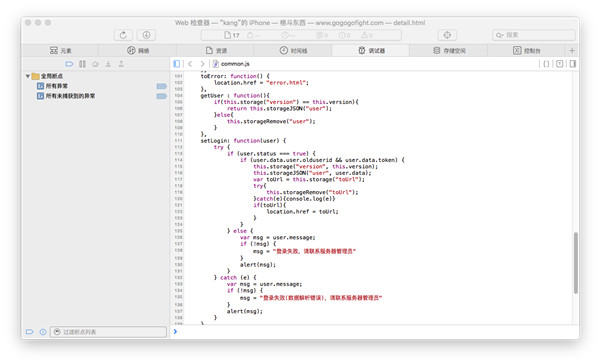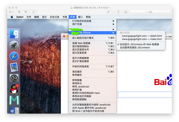 到此,准备工作完成。这时候讲iPhone链接到mac上,打开Safari浏览器,运行手机app里面的web页面,在开发菜单中选择连接的手机,找到调试的网页,就能在Safari里面调试了