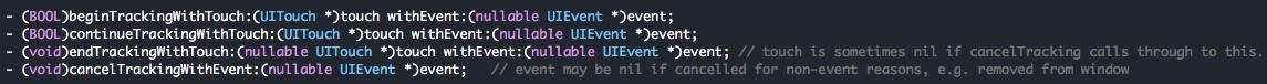 - (BOOL)beginTrackingWithTouch:(UITouch *)touch withEvent:(UIEvent *)event {