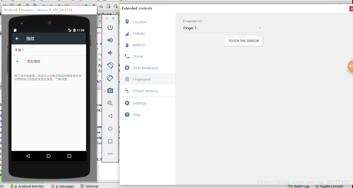 接下来我们用模拟器做测试,出于安全的考虑谷歌暂时没有开放指纹存储的功能,因此该功能使用的是系统里的指纹,也就是我们传统的用于解锁屏幕时设置的指纹,为了测试我们去模拟器里设置一个指纹