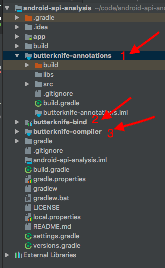- butterknife-compiler: 解析编译生成库,解析声明类中的注解,在编译时自动生成相应的代码。