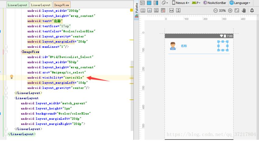 1.首先在一行的xml布局中添加一个选中效果的icon图片,未选中的情况下INVISIBLE或者GONE 都可以,推荐使用INVISIBLE它会占用布局位置但是不显示,这样可以避免布局中其他控件因为勾选布局的消失而轻微变动位置
