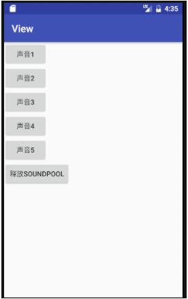<LinearLayout xmlns:android="http://schemas.android.com/apk/res/android" xmlns:tools="http://schemas.android.com/tools" android:layout_width="match_parent" android:layout_height="match_parent" android:orientation="vertical" tools:context=".MainActivity"> <Button android:id="@+id/btn_play1" android:layout_width="wrap_content" android:layout_height="wrap_content" android:text="声音1" /> <Button android:id="@+id/btn_play2" android:layout_width="wrap_content" android:layout_height="wrap_content" android:text="声音2" /> <Button android:id="@+id/btn_play3" android:layout_width="wrap_content" android:layout_height="wrap_content" android:text="声音3" /> <Button android:id="@+id/btn_play4" android:layout_width="wrap_content" android:layout_height="wrap_content" android:text="声音4" /> <Button android:id="@+id/btn_play5" android:layout_width="wrap_content" android:layout_height="wrap_content" android:text="声音5" /> <Button android:id="@+id/btn_release" android:layout_width="wrap_content" android:layout_height="wrap_content" android:text="释放SoundPool" /> </LinearLayout>