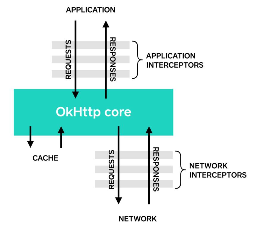 从图中可以看出,拦截器分为应用拦截器和网络拦截器两种。应用拦截器是在发送请求之前和获取到响应之后进行操作的,网络拦截器是在进行网络获取前进行操作的。