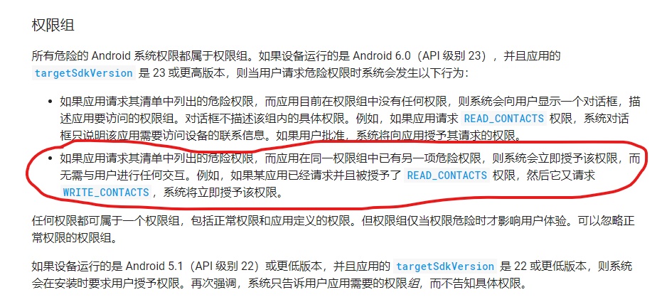 意思是,对危险权限进行了分组,同一组中,只要有有一个权限被授权了,同组中其它权限也就默认授权了。比如,我授权应用有读存储卡的权限之后,应用也就有了写存储卡的权限,事实上也确实如此。