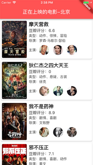 这个小例子使用的是豆瓣 API 中 正在上映的电影 的开放接口,要实现的主要效果如下: