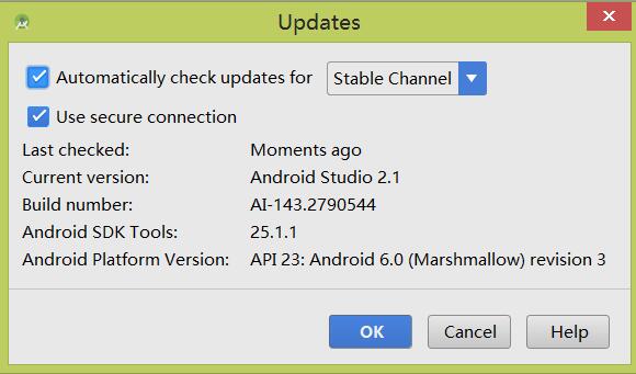 Android Studio支持自动检查更新。之前尚未发布正式版时,一周有时会有几次更新。你可以设置检查的类型,用以控制更新类型。Settings –> Updates 。勾选 Check for updates in channel ,即开通了自动检查更新。你可以禁用自动检查更新。右侧的列表,是更新通道。