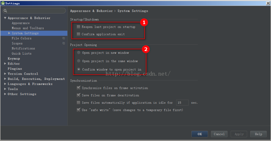 ①禁用自动打开上次关闭工程 ,禁用退出提示 ②打开新项目提示方式