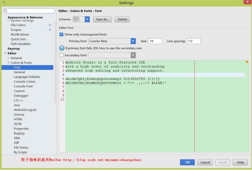 如果想修改编辑器的字体,以及所有的文件显示的字体,可以如下设置: Settings –> Editor –> Colors & Fonts –> Font 。默认系统显示的 Scheme 为 Defualt ,你是不能编辑的,你需要点击右侧的 Save As… ,保存一份自己的设置,并在当中设置。之后,在 Editor Font 中即可设置字体。我喜欢用Courier New字体。
