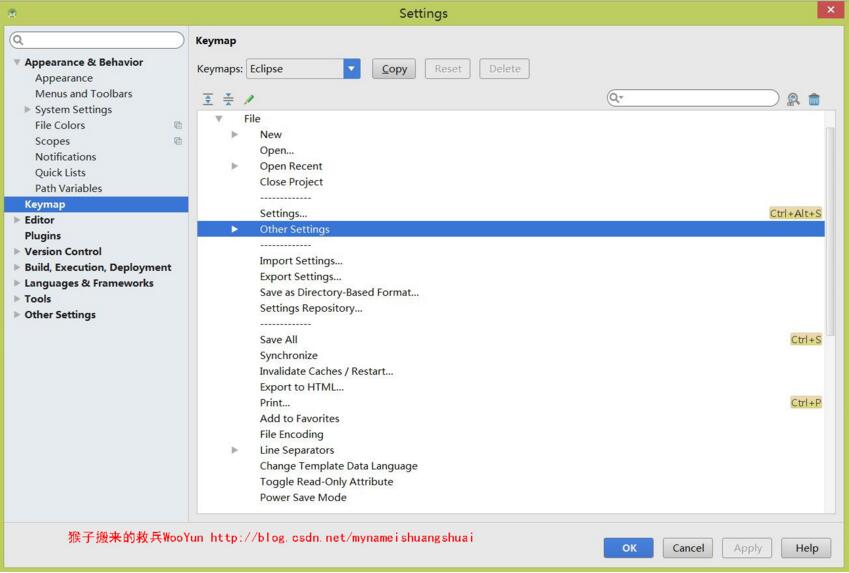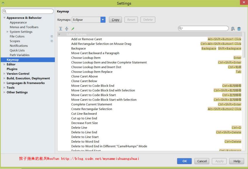 首先你可以在Android Studio中使用Eclipse的快捷键。也可以单独设置: Settings –> Keymap 。从 Keymaps 中选择对应IDE的快捷键,Android Studio对其他IDE的快捷键支持还是比较多的。建议不使用其他IDE的快捷键,而是使用Android Studio的快捷键。