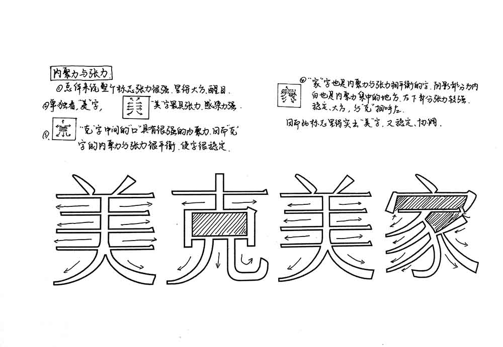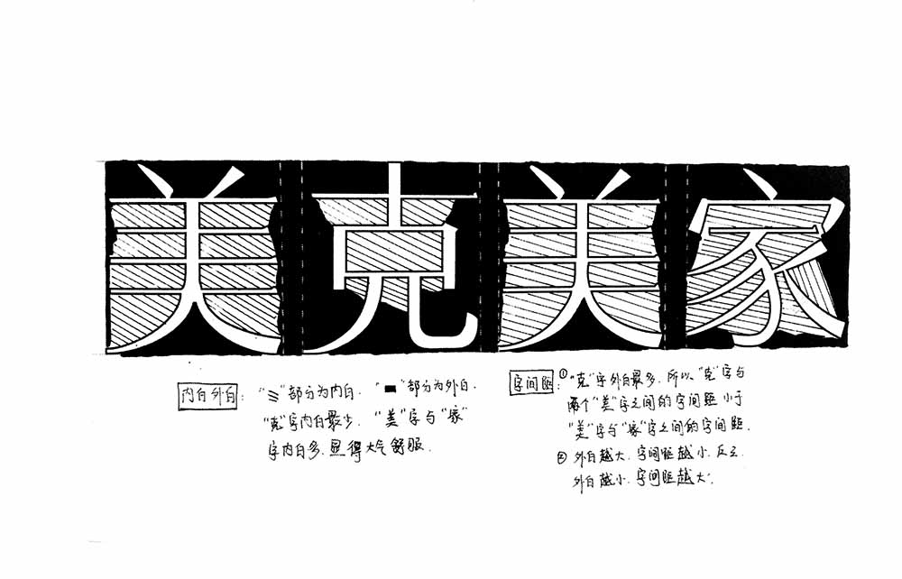 -布白均匀决定着一个字的品相和气质,中国书法讲究计白当黑。外白与内白在的大小影响着字与字之间的距离,克字外白最大,所以它与相邻的美字之间的距离要小于美字与家字之间的距离。尤其在西文字体中,字母之间的距离不是均等的就是这个道理。