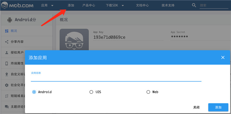 访问mob官网http://mob.com注册账号–》点击头像进入“后台中心”–》选择shareSDK–》添加应用–》获取AppKey。