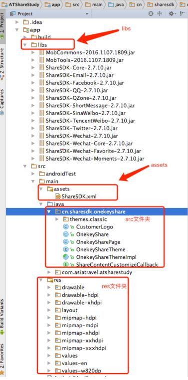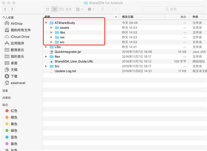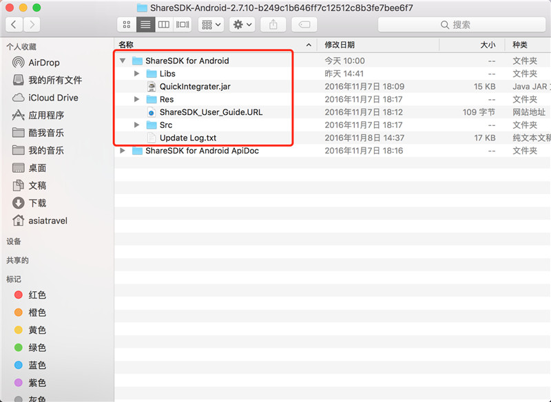 上面这张图就是我们下载下来的sdk的所有文件,其中我们集成用到的就是红色区域标记的部分。