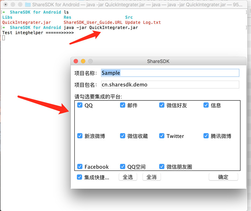 使用java -jar命令编译我们下载的QuickIntegrater.jar文件,就会弹出一个对话框,我们添入我们的项目名称还有包名,点击确定,然后就会自动生成一个和我们项目相关的文件夹。如下图所示: