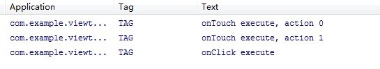 可以看到,onTouch是优先于onClick执行的,并且onTouch执行了两次,一次是ACTION_DOWN,一次是ACTION_UP(你还可能会有多次ACTION_MOVE的执行,如果你手抖了一下)。因此事件传递的顺序是先经过onTouch,再传递到onClick。