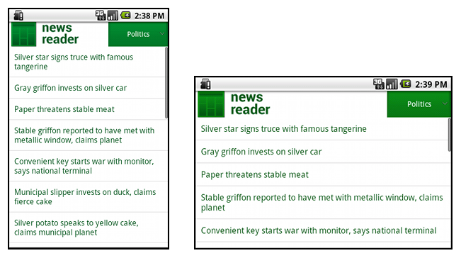 有些布局会在横屏和竖屏的情况下都显示的很好,但是多数情况下这些布局都可以再调整的。在News Reader示例程序中,布局在不同屏幕尺寸和不同屏幕方向中是这样显示的: