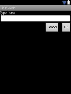 <?xml version="1.0" encoding="utf-8"?> <RelativeLayout xmlns:android="http://schemas.android.com/apk/res/android" android:layout_width="match_parent" android:layout_height="match_parent"> <TextView android:id="@+id/label" android:layout_width="match_parent" android:layout_height="wrap_content" android:text="Type here:"/> <EditText android:id="@+id/entry" android:layout_width="match_parent" android:layout_height="wrap_content" android:layout_below="@id/label"/> <Button android:id="@+id/ok" android:layout_width="wrap_content" android:layout_height="wrap_content" android:layout_below="@id/entry" android:layout_alignParentRight="true" android:layout_marginLeft="10dp" android:text="OK" /> <Button android:layout_width="wrap_content" android:layout_height="wrap_content" android:layout_toLeftOf="@id/ok" android:layout_alignTop="@id/ok" android:text="Cancel" /> </RelativeLayout>
