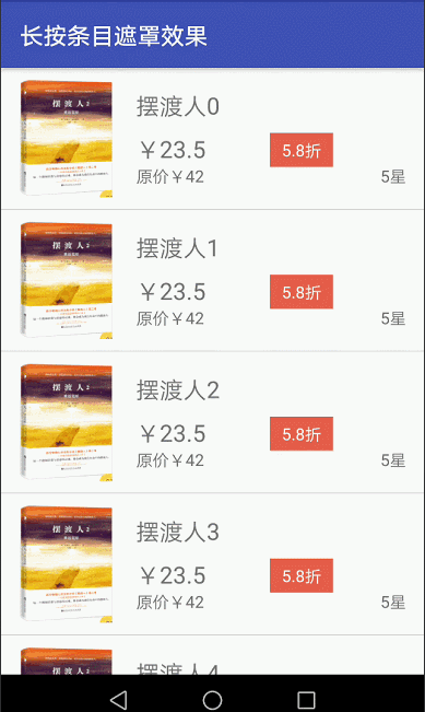 长按条目时,弹出遮罩的效果遮挡在原来的条目布局上; 页面滑动或点击其他的条目,上一个正在遮罩的条目遮罩消失。 长按其他条目时,上一个遮罩的条目撤销遮罩,当前长按的显示遮罩; 条目添加遮罩的时添加动画;
