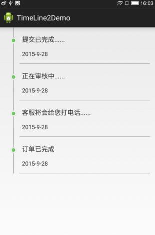 <?xml version="1.0" encoding="utf-8"?> <RelativeLayout xmlns:android="http://schemas.android.com/apk/res/android" android:layout_width="match_parent" android:layout_height="match_parent" android:orientation="vertical" > <View android:id="@+id/view_0" android:layout_width="1dp" android:layout_height="25dp" android:layout_below="@+id/layout_1" android:layout_marginLeft="40dp" android:background="#A6A6A6" /> <ImageView android:id="@+id/image" android:layout_width="15dp" android:layout_height="15dp" android:layout_below="@+id/view_0" android:layout_marginLeft="33dp" android:src="@drawable/timeline_green" /> <View android:id="@+id/view_2" android:layout_width="1dp" android:layout_height="50dp" android:layout_below="@+id/image" android:layout_marginLeft="40dp" android:background="#A6A6A6" /> <View android:id="@+id/view_4" android:layout_width="match_parent" android:layout_height="1dp" android:layout_alignBottom="@+id/view_2" android:layout_marginLeft="55dp" android:layout_marginRight="15dp" android:background="#A6A6A6" /> <RelativeLayout android:id="@+id/relative" android:layout_width="fill_parent" android:layout_height="match_parent" android:layout_margin="10dp" android:layout_toRightOf="@+id/view_0" android:layout_alignBottom="@+id/view_4" android:padding="5dp" android:orientation="vertical" > <TextView android:id="@+id/title" android:layout_width="match_parent" android:layout_height="wrap_content" android:ellipsize="end" android:layout_marginTop="8dp" android:maxEms="7" android:paddingLeft="5dp" android:singleLine="true" android:text="需求提交成功" android:textSize="16sp" /> <TextView android:id="@+id/time" android:layout_width="match_parent" android:layout_height="wrap_content" android:ellipsize="end" android:layout_below="@+id/title" android:layout_marginTop="15dp" android:maxEms="7" android:paddingLeft="5dp" android:singleLine="true" android:text="2015-9-28" android:textSize="14sp" /> </RelativeLayout> </RelativeLayout>