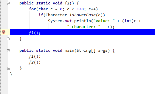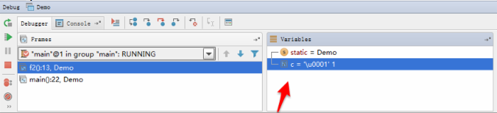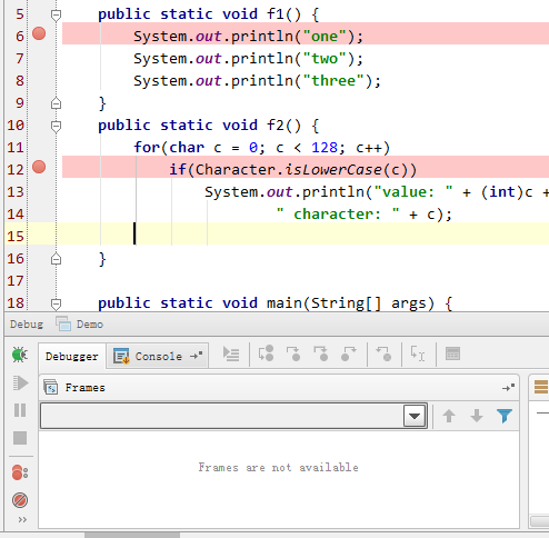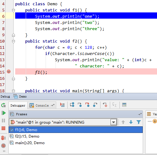 IDE下方出现Debug视图,红色的箭头指向的是现在调试程序停留的代码行,方法f2()中,程序的第11行。红色箭头悬停的区域是程序的方法调用栈区。在这个区域中显示了程序执行到断点处所调用过的所用方法,越下面的方法被调用的越早。