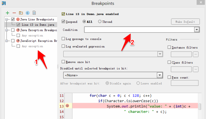 箭头1指向的是你曾经设置过的断点,箭头2可以设置条件断点(满足某个条件的时候,暂停程序的执行,如 c==97)。结束调试后,应该在箭头1处把所设的断点删除(选择要删除的断点后,点击上方的红色减号)。