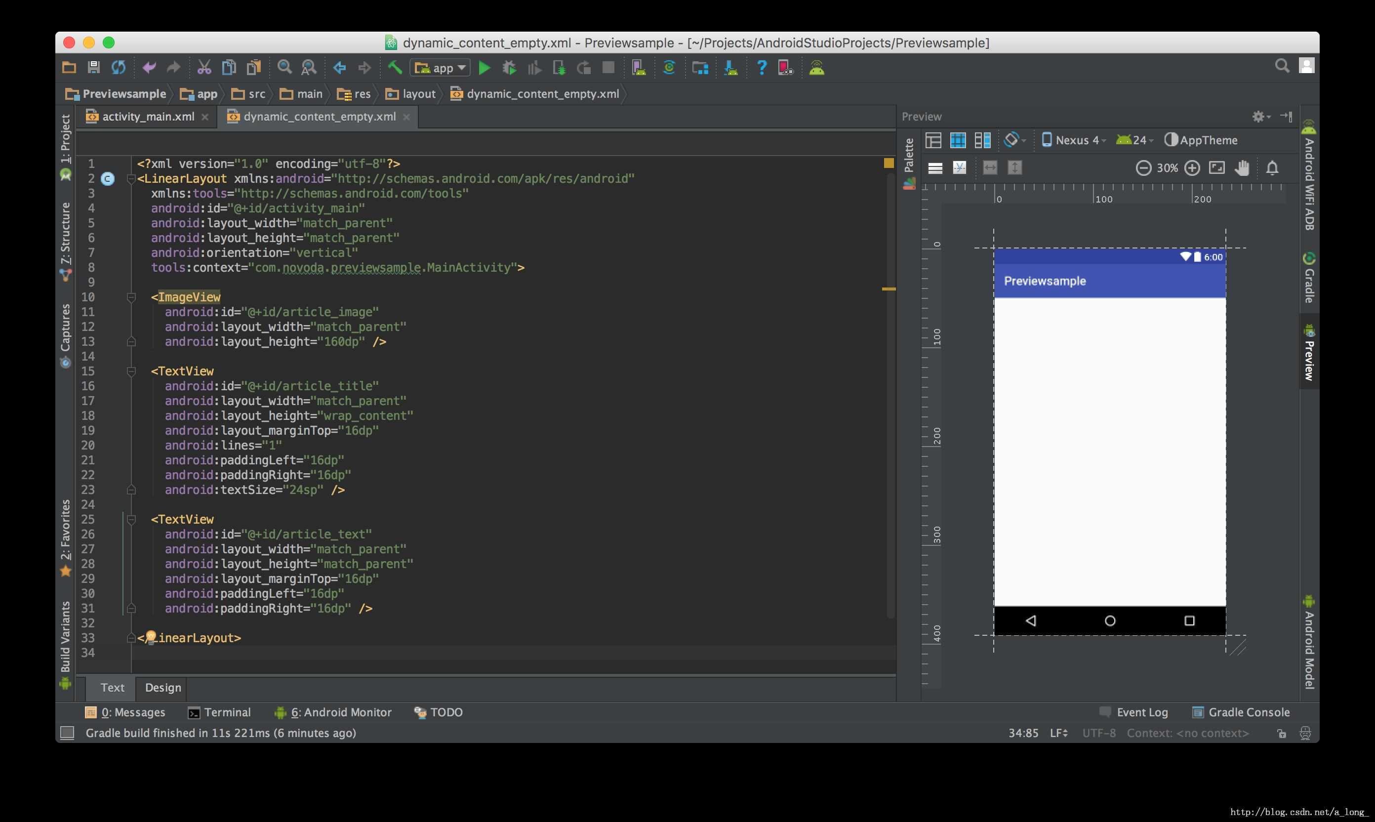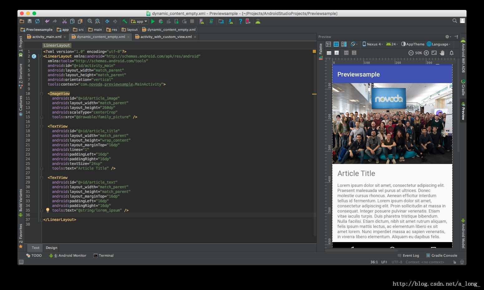 当创建使用任何后端数据相关视图的布局时,一个好的做法是仅在预览时填充它。通过使用tools命名空间而不是android来声明xml属性,这将允许您指定只在预览时使用的属性。例如我们使用tools:text =“Title”和tools:src =“@ drawable / cool_pic”,大功告成!